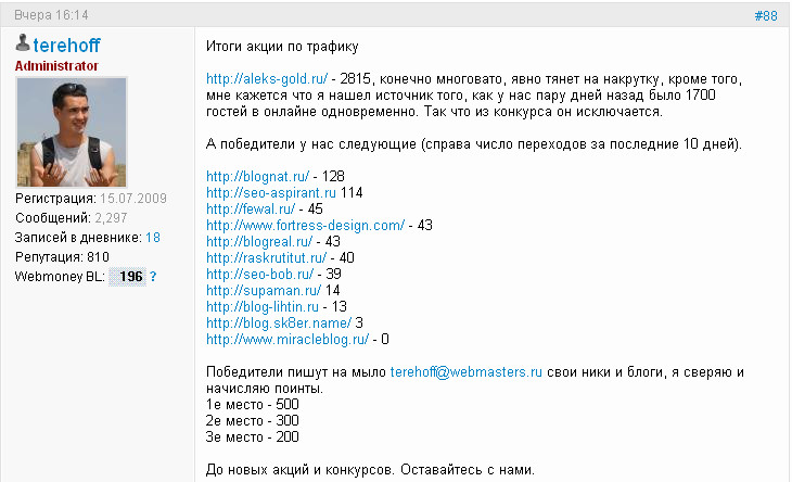 Кстати, народ, у кого есть блоги с хорошей посещалкой от 100 уников (возможно и меньше) могут получить +100 поинтов на форуме за обзор шопа. Подробности тут: .